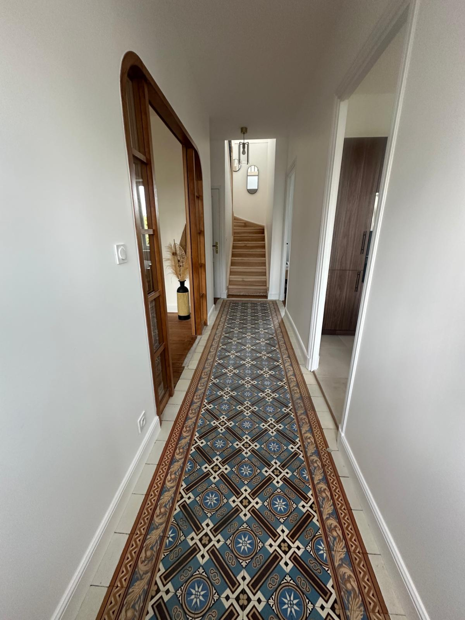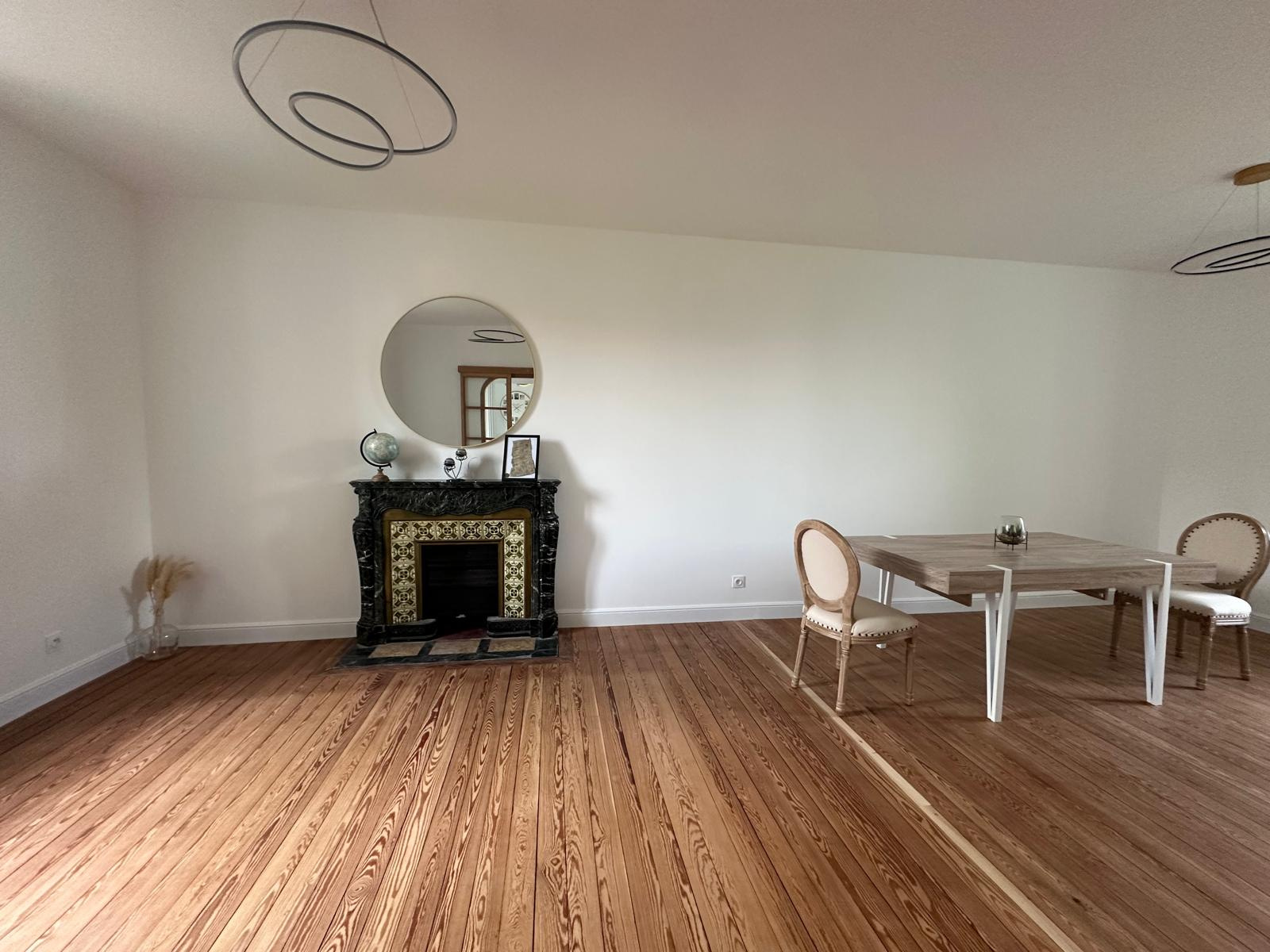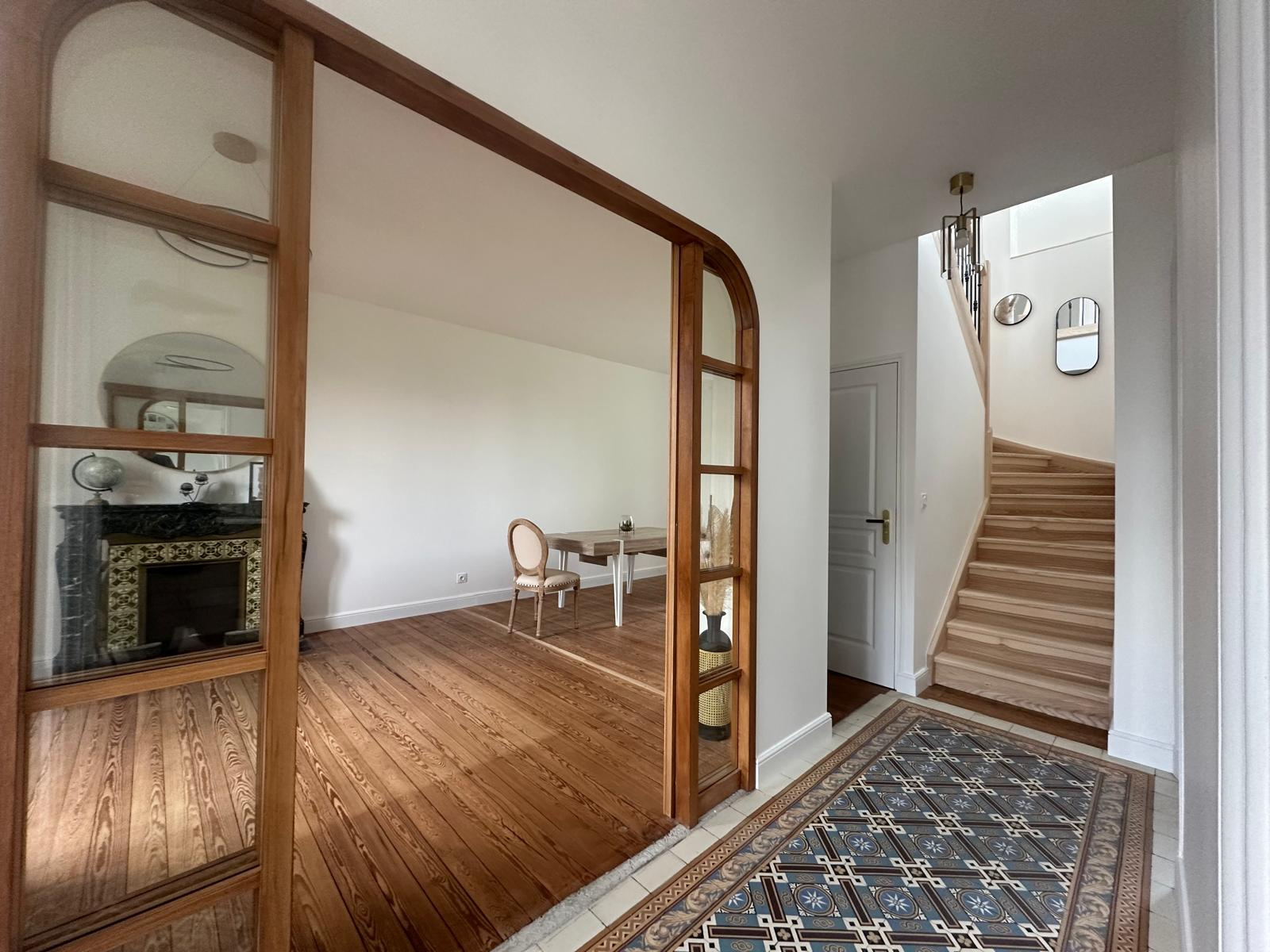 Les éléments d’origine, tels que les parquets restaurés et l’escalier en bois clair, apportent une signature élégante et authentique.